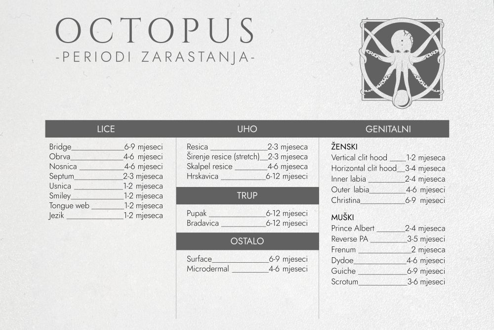 Upute za održavanje piercinga nisu univerzalno definirane tako da različiti piercing saloni mogu imati različite upute. Ukoliko ste se pirsali u Octopusu, molimo da se pridržavate naših uputa za njegu piercinga. Sastavljene su na temelju višegodišnjeg iskustva kako bi Vam olakšale proces zarastanja.